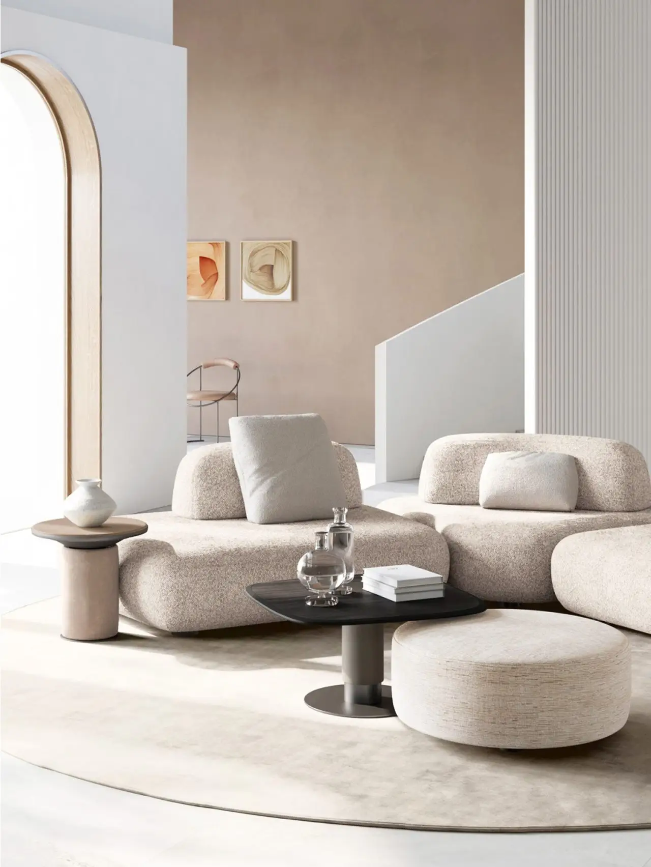 Welcome to order bespoke living room furniture. This custom made sofa features a soft, light beige fabric upholstery and a sleek, curved modular design, allowing for flexible configurations such as L-shaped or wraparound layouts. Color, size, and materials can all be customized.