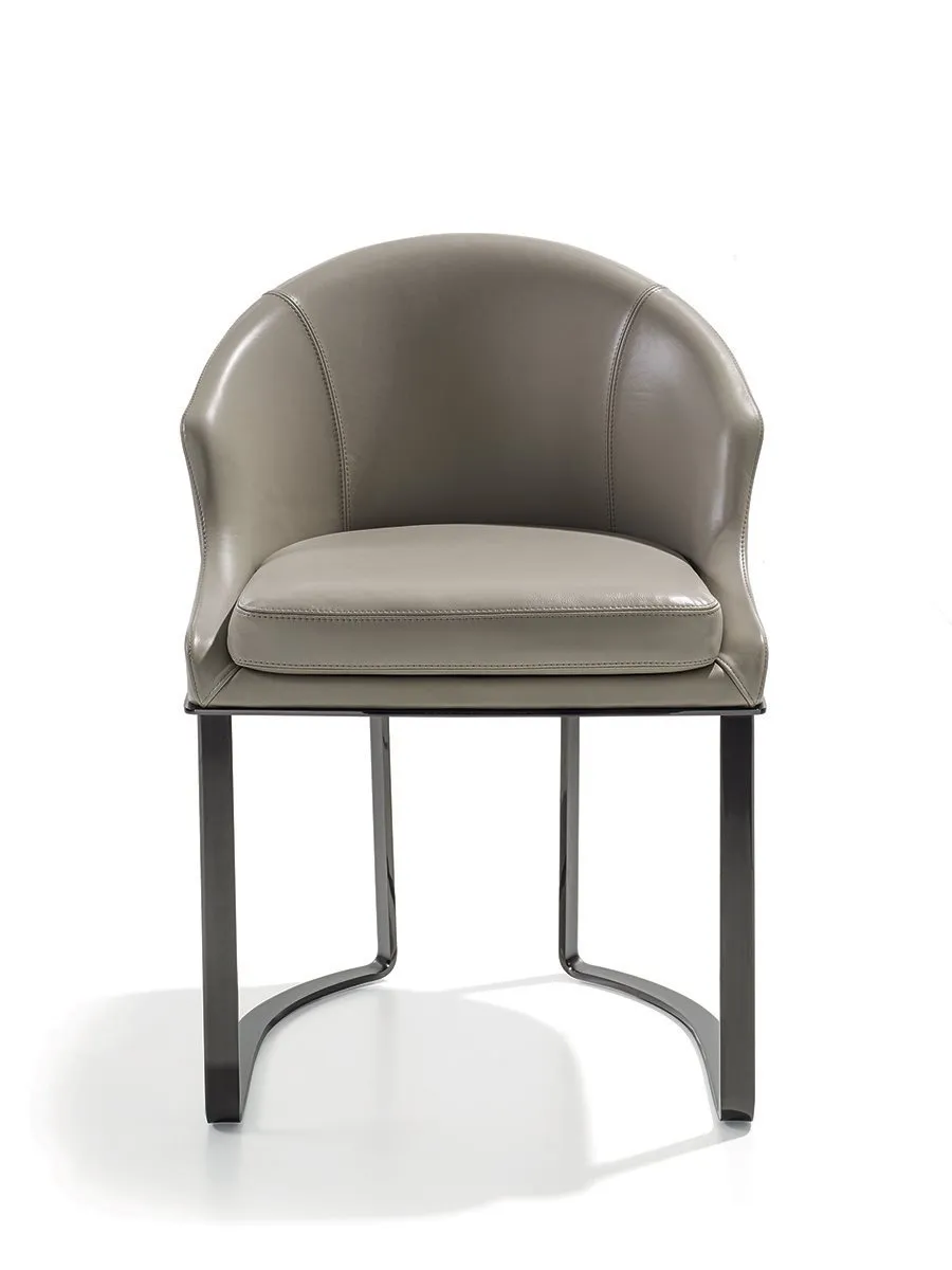 Welcome to order dining room furniture. This custom upholstered dining chair is crafted from suede/ soft leather, featuring a curved backrest and high-density foam padding, accented with sleek metal legs.