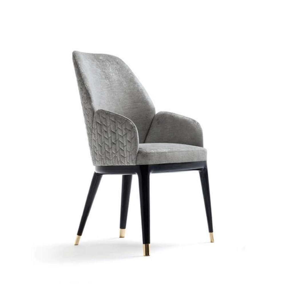 - Gold-Tipped Legs: The legs of this elegant gray dining chair are adorned with gold-tipped accents; the metallic luster creates a sophisticated contrast against the chair’s primary gray tone, exuding a refined sense of “light luxury” design.